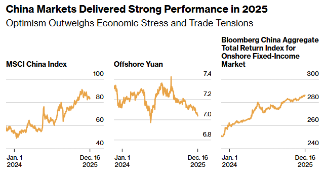 Equities, the yuan, and onshore government bonds are all on track to post gains in 2025, a combination not seen in several years.