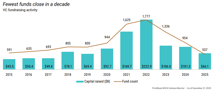 Since 2022, investors have received almost $200 billion less than they put in, and fundraising for new VC funds has fallen to its lowest level in a decade.
