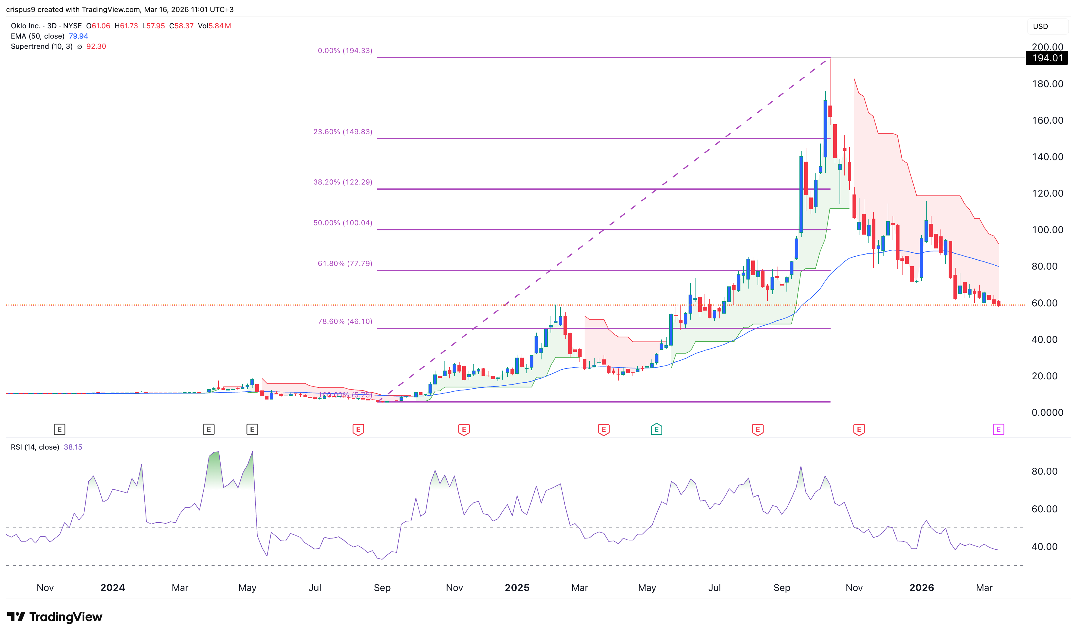 Oklo stock price has slumped to its lowest level since July 2025. It has tumbled from last year’s high of $194 to $58, with its market capitalisation dropping from over $24 billion to $9.12 billion.
