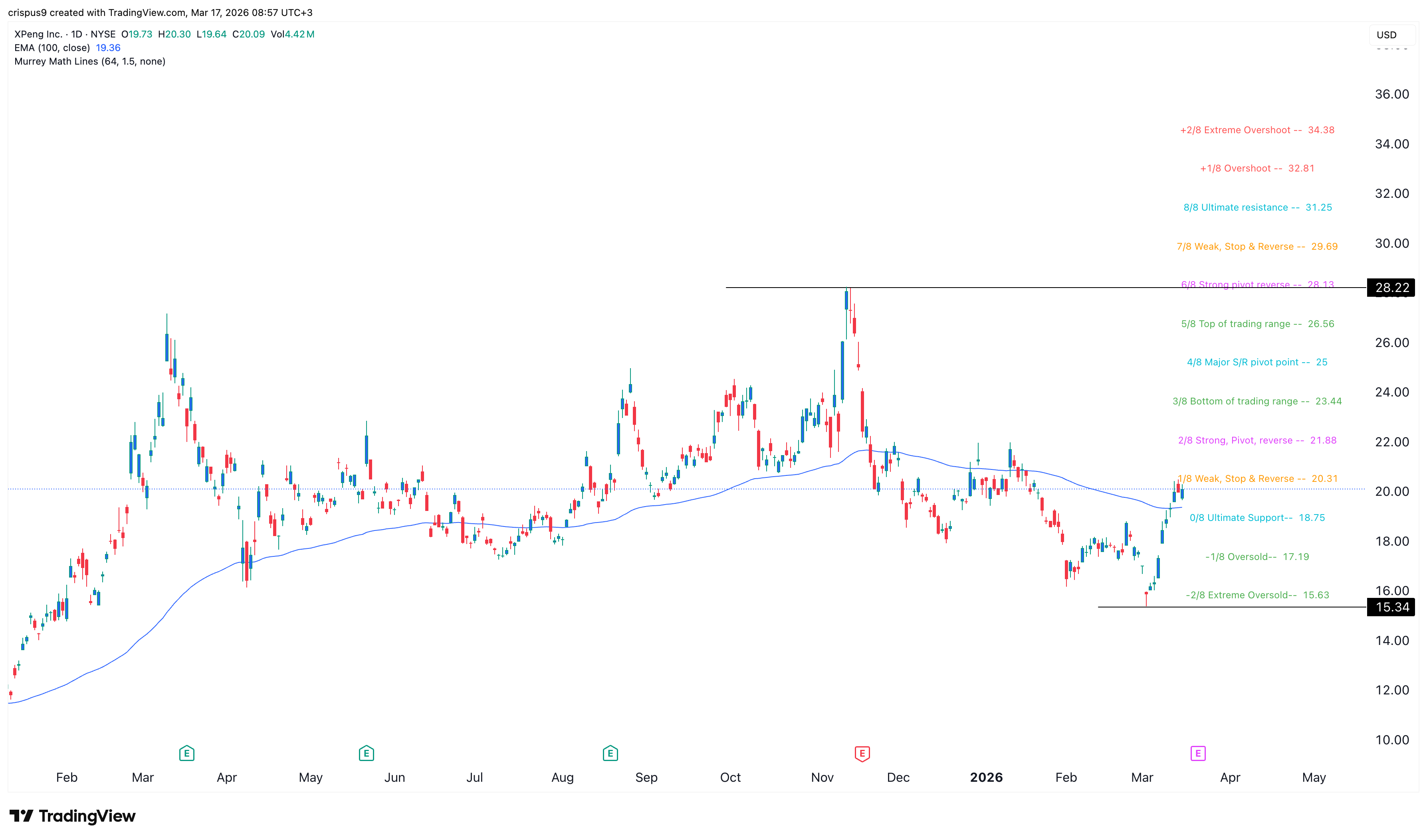 The daily chart shows that the XPEV stock price bottomed at $15.34 on March 3, when it formed a dragonfly doji candlestick pattern.