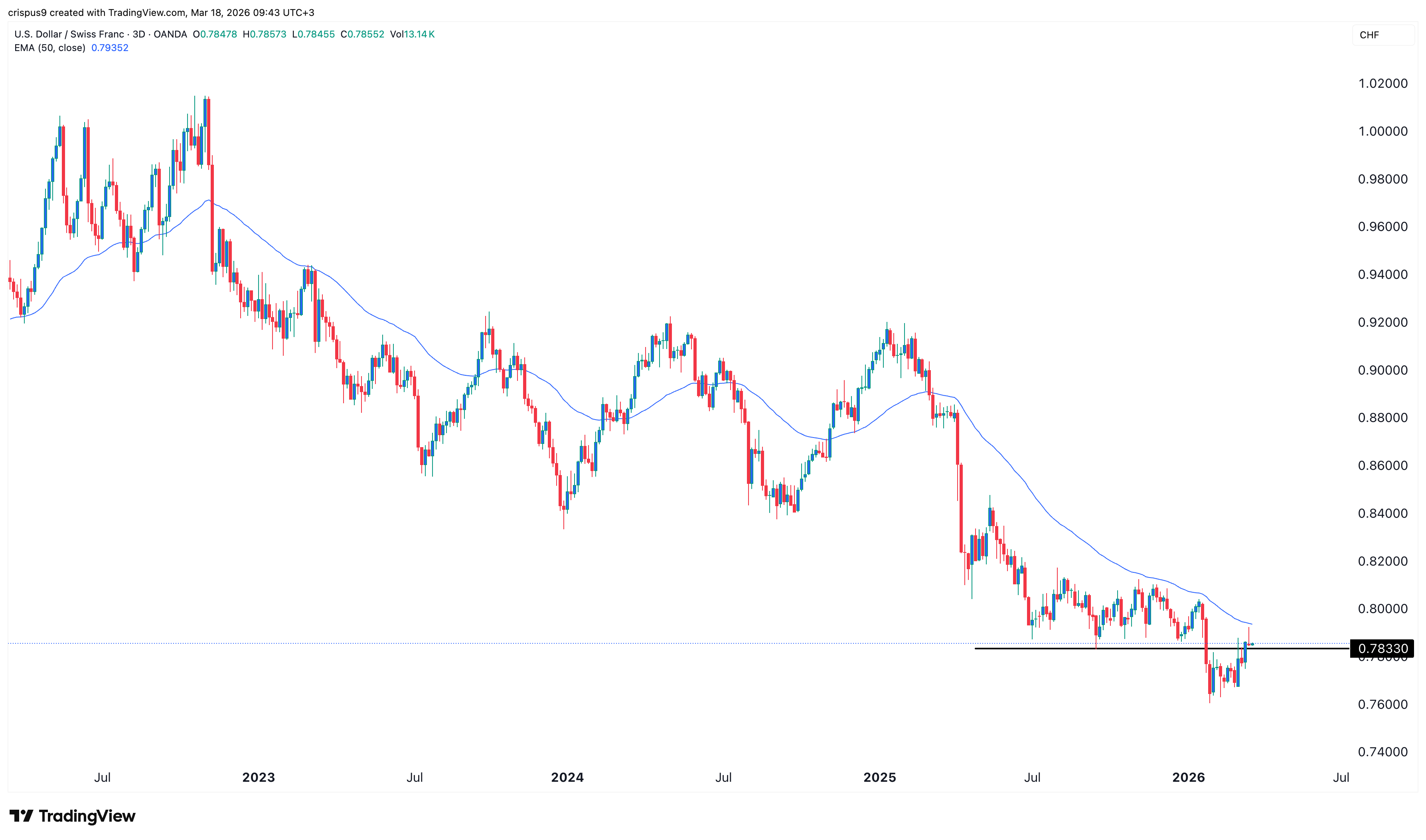 The three-day chart shows that the USD/CHF pair remains in a bear market and is hovering near its lowest level in years. It trades at 0.7833, slightly above the year-to-date low of 0.7600.