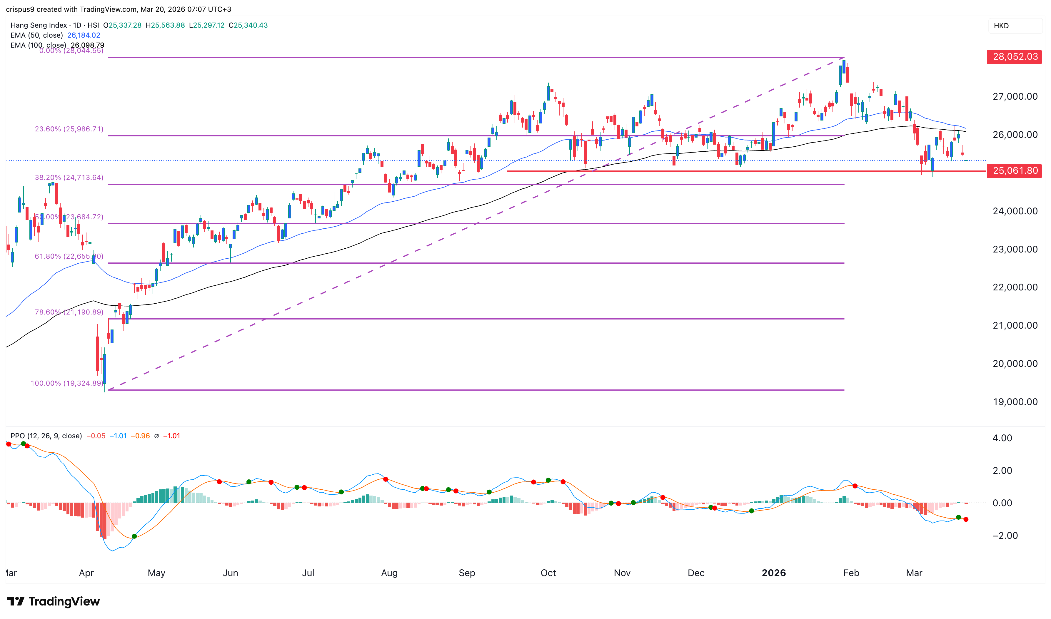 The daily timeframe chart shows that the Hang Seng Index has slumped since February this year when it peaked at $28,052 to the current $25,330.