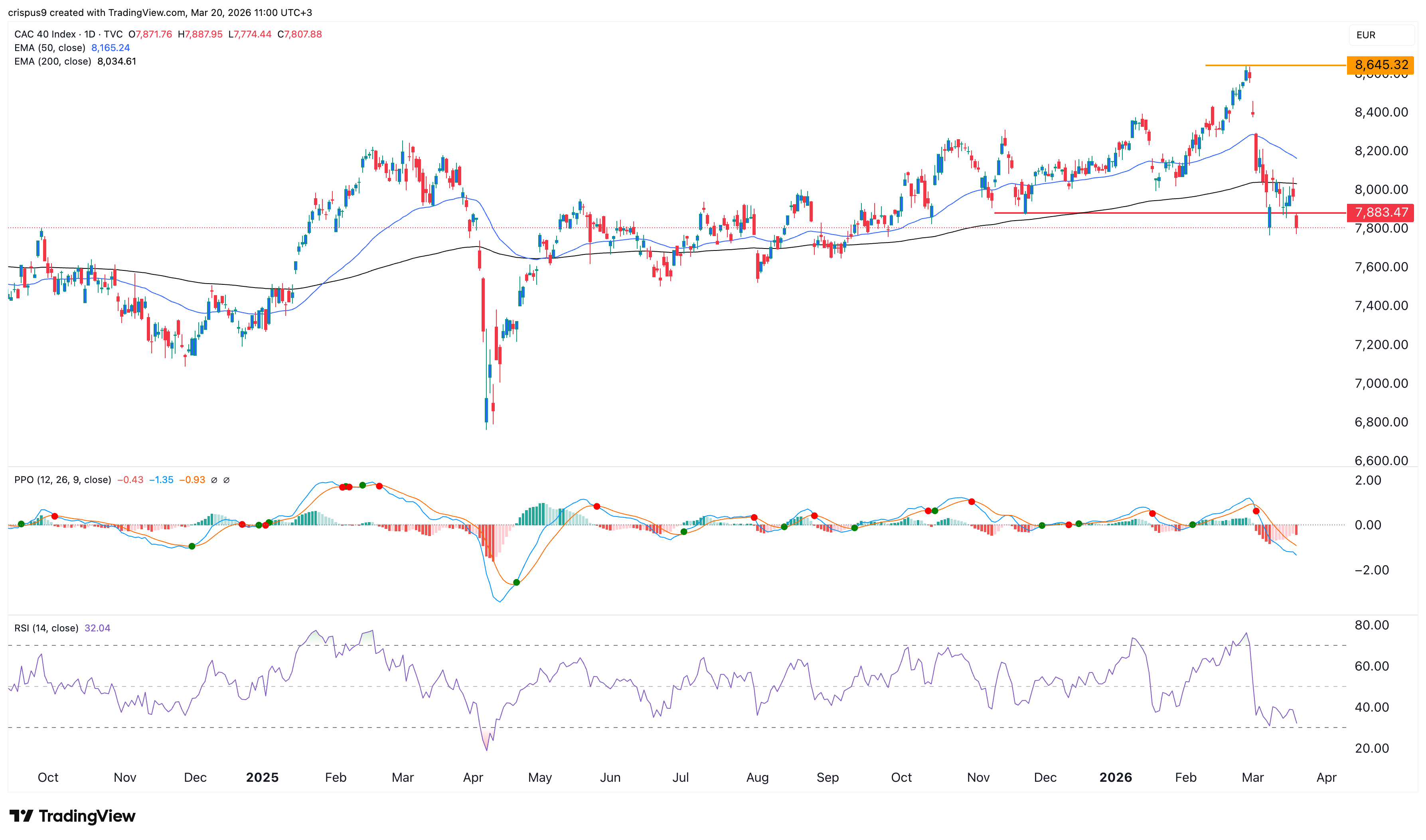 The CAC 40 Index has dropped into a correction after falling by ~10% from its highest point this year. It slipped from €8,645 in February to €7,807, its lowest level since September last year. This trend may continue as the Iran war escalates.