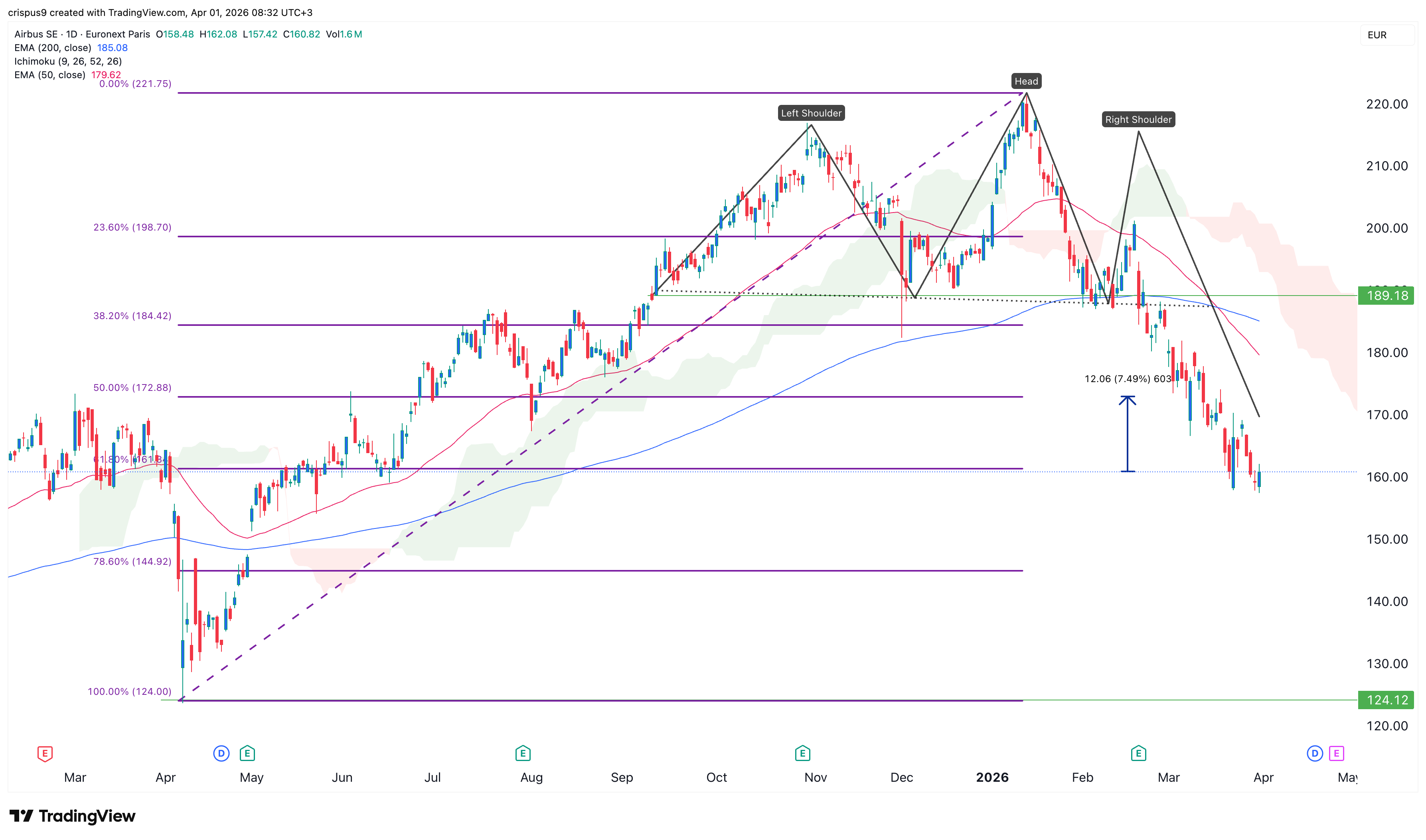 Airbus shares have moved below the Supertrend and the Ichimoku cloud indicators, a sign that bears remain in control. The stock is hovering at the 61.8% Fibonacci Retracement level, where it has formed a small double-bottom pattern.