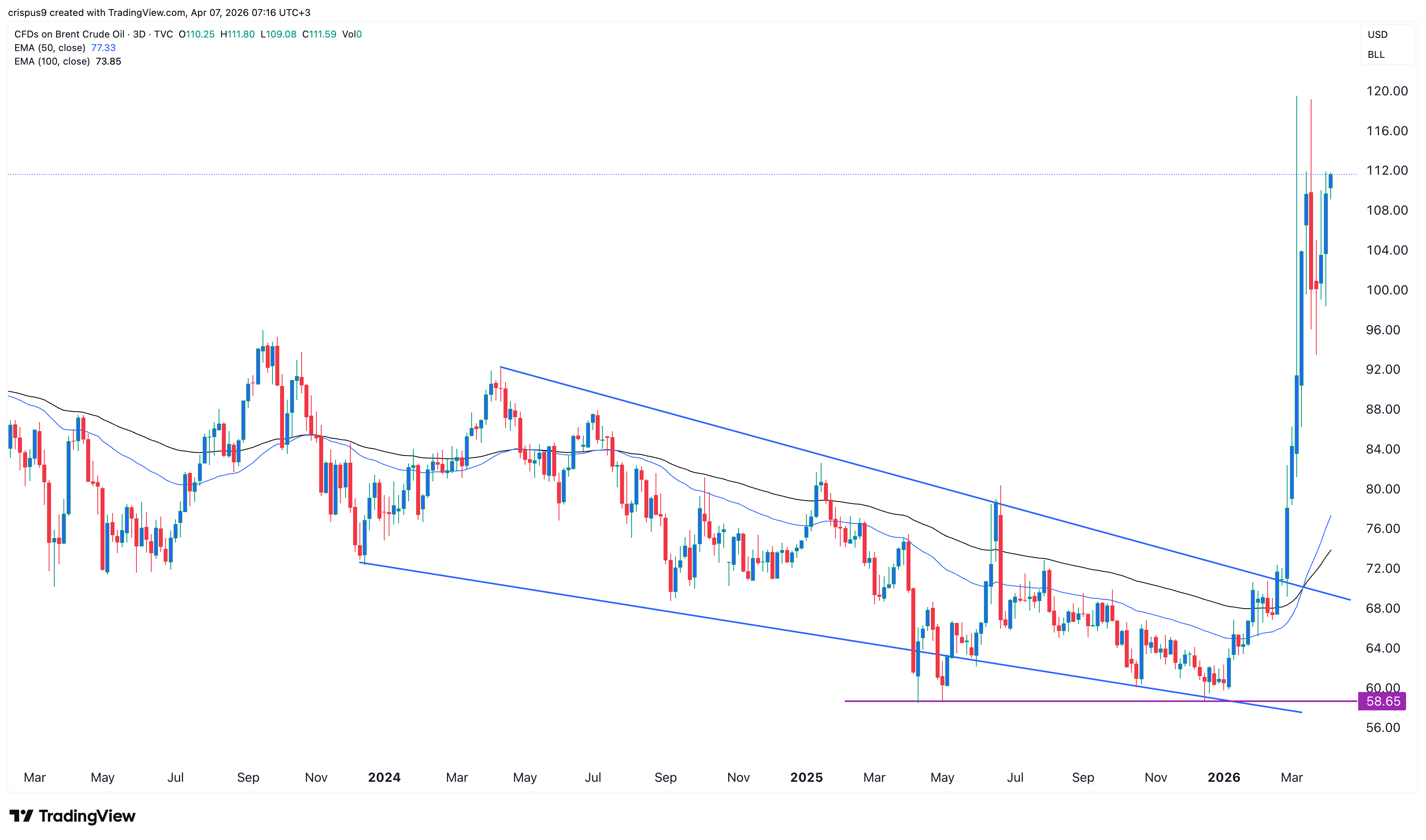 Brent crude oil price continued its strong rally on Tuesday morning as market participants waited for an update from President Donald Trump on his plans on Iran. It jumped to $111.25, while the West Texas Intermediate (WTI) jumped to $116.