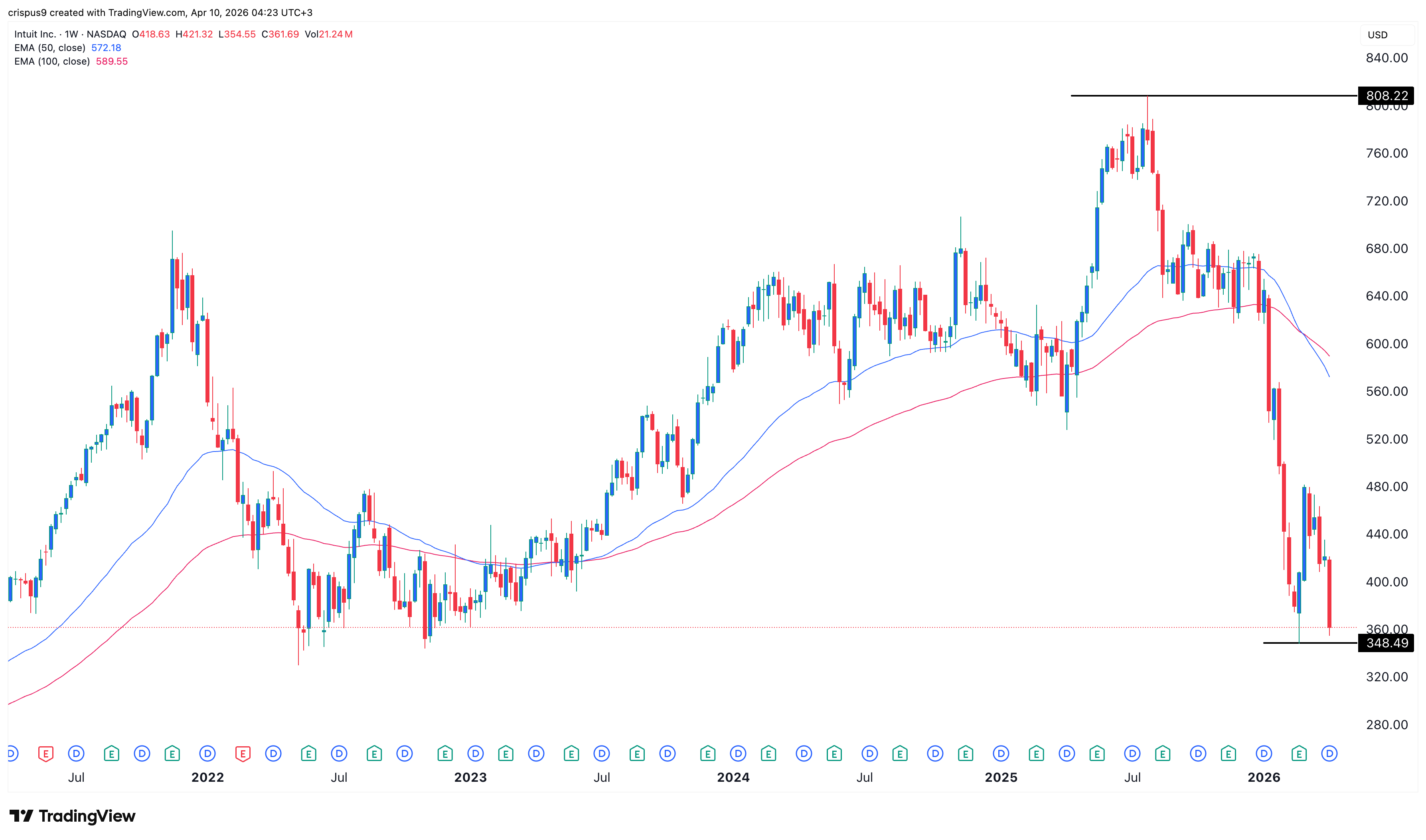 Intuit stock price crash continued today, April 9, reaching its lowest level since February 26 amid the rising concerns about the impact of artificial intelligence (AI) tools on its business. INTU dropped to $360, down by 55% from its highest point in 2025.