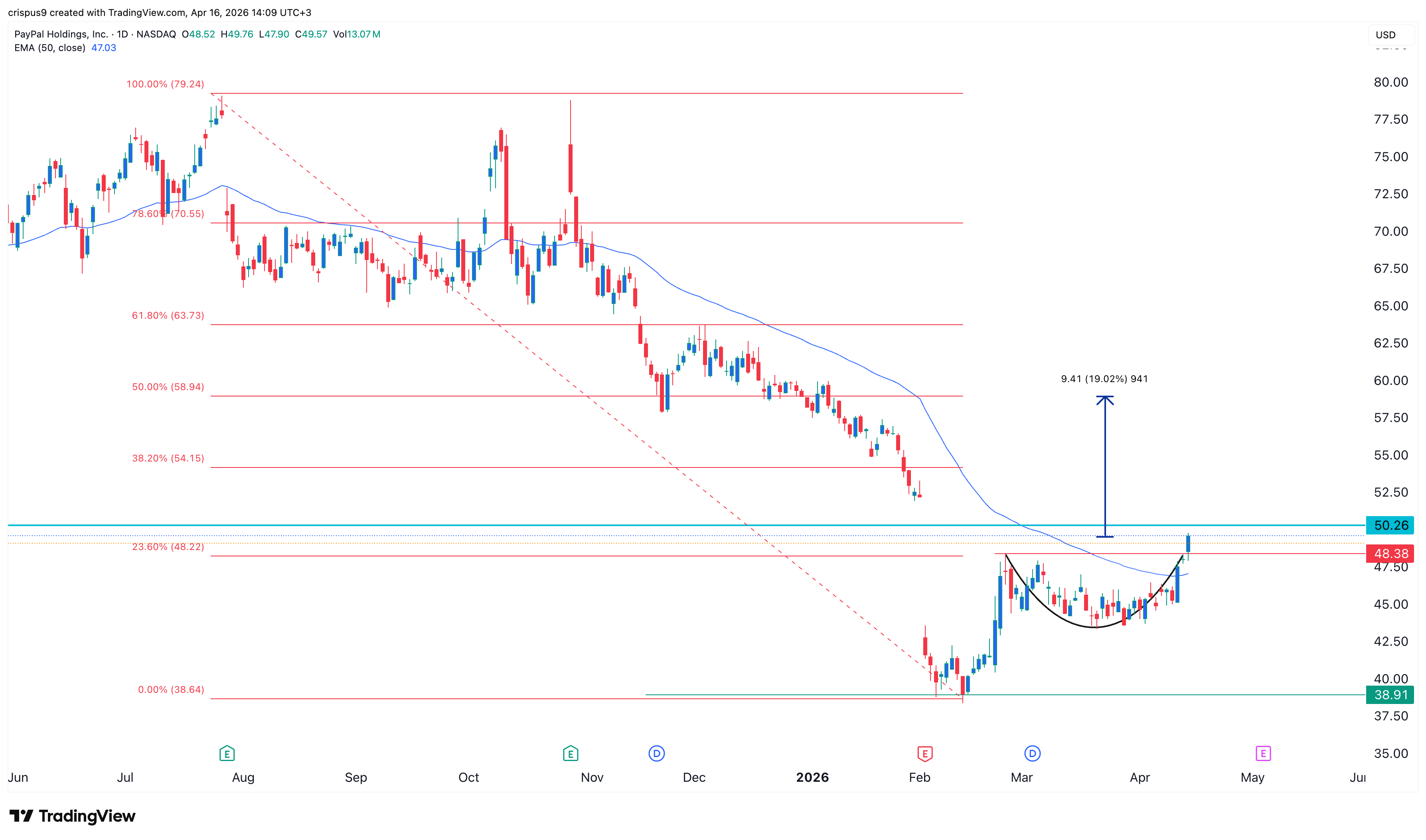 The daily chart shows that the PYPL stock price crashed to a low of $38.91 in February and then bounced back to the current $50. It is attempting to fill the gap it made after releasing weak financial results.