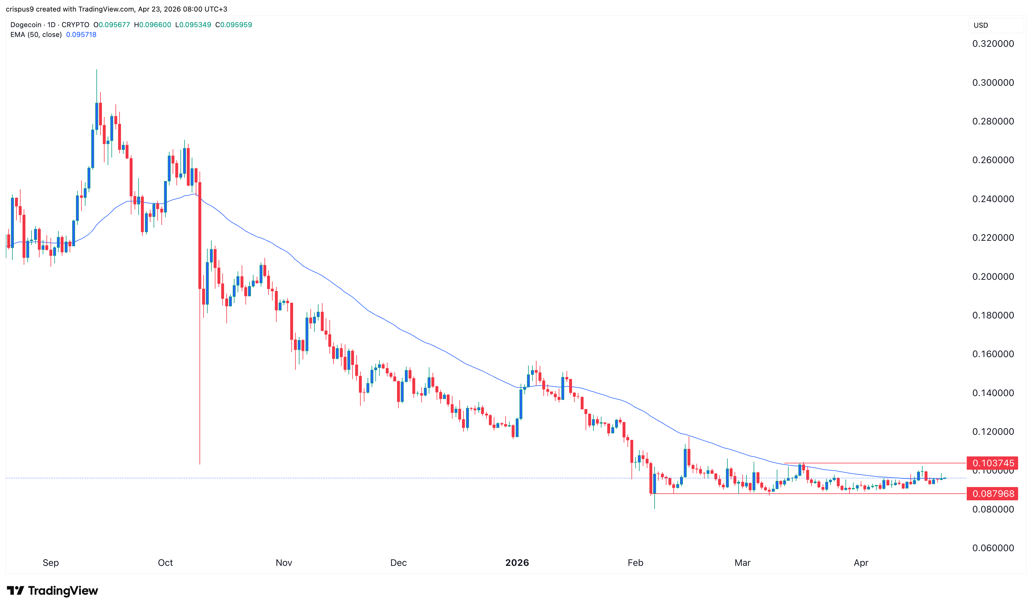 Dogecoin price has moved sideways in the past three months as the crypto winter has continued and as demand for the DOGE ETFs dried. DOGE token was trading at $0.0945 on Thursday, inside the narrow range it has been since January.